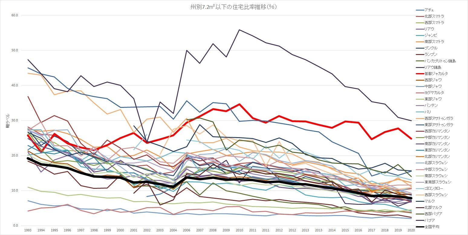 2020年度においてジャカルタは25%で、パプアの30%に次いで多く、2020年においても四軒に一軒が四畳前後という実態です。
