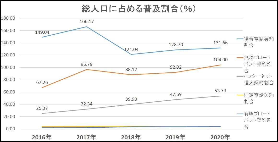 また、携帯電話契約割合は131.66%で、2017年に比べると減っていますが、平均すると一人1.3台を持っていることになります。
