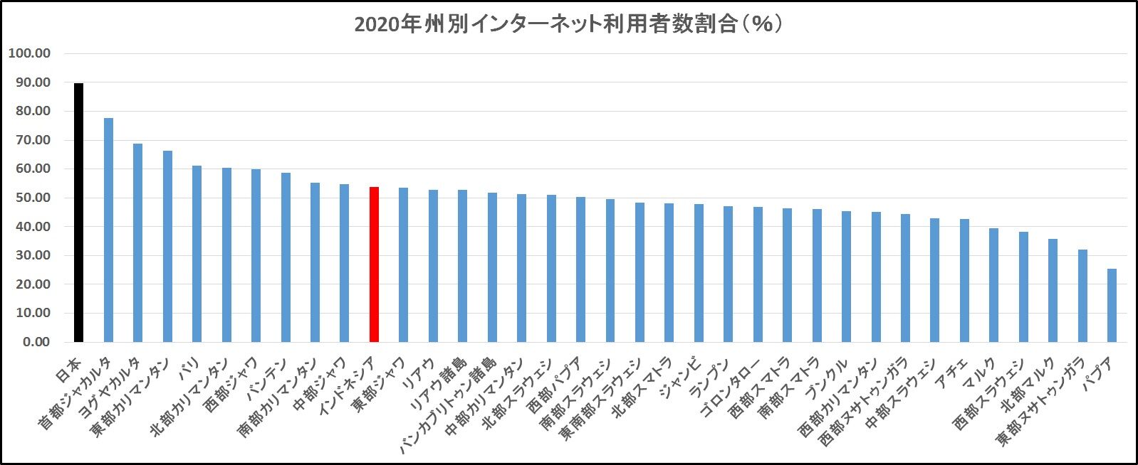 2020年の州別インターネット利用者割合はジャカルタが77.61%で、日本全体の89.80%に迫りつつあります。