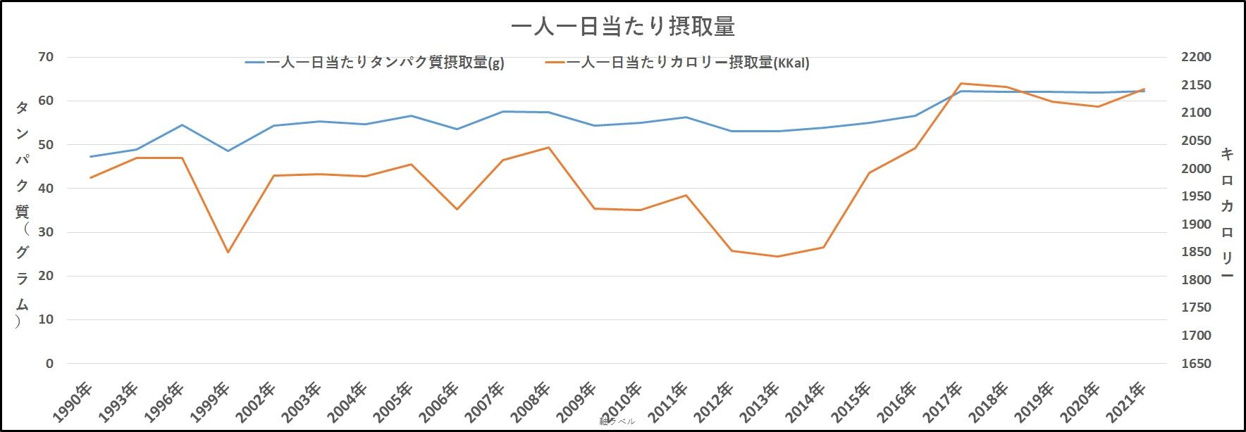 先の記事で2015年以降の鶏卵の消費量が急増したと報じましたが、それに合わせてカロリー摂取量も増えています。