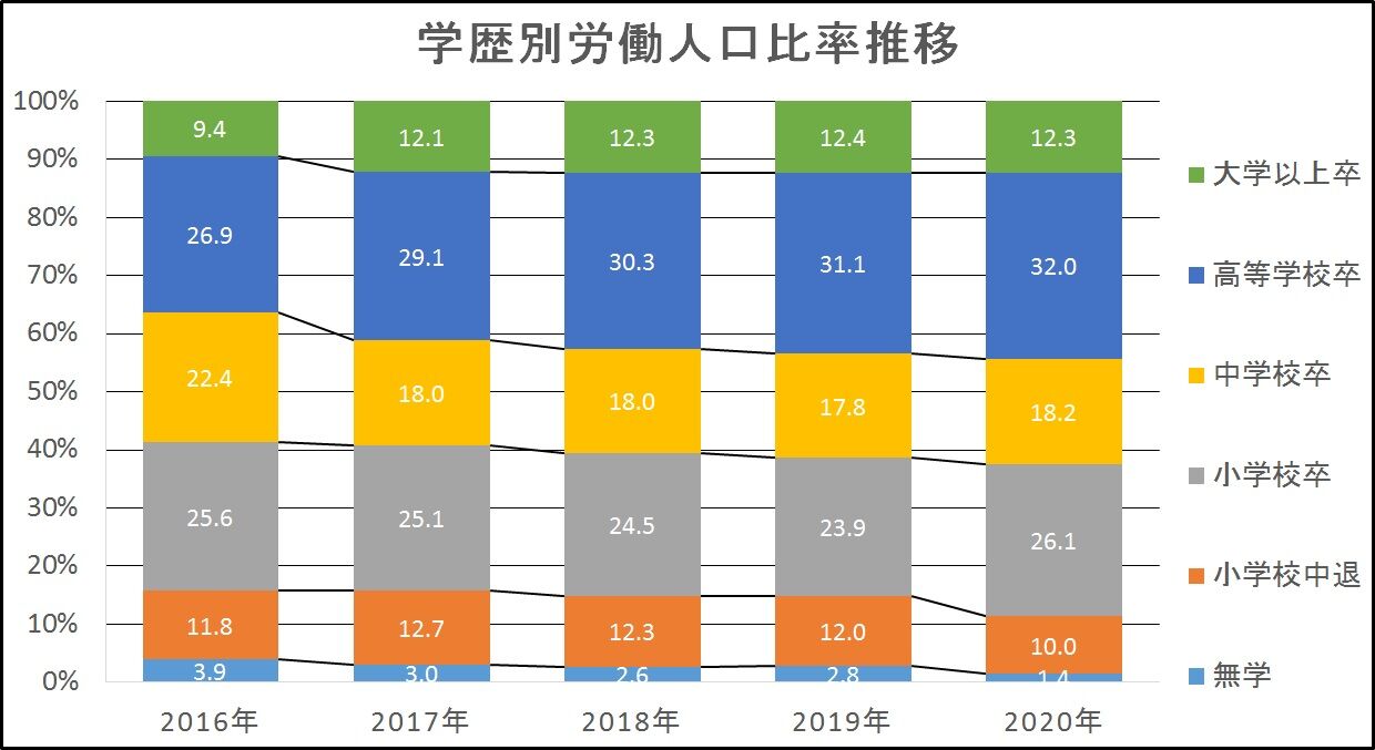 2016年から2020年にかけての傾向としては、中学校卒の労働力が減った分、高等学校卒が増えたと言えるでしょう。