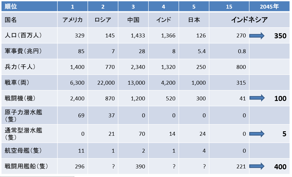 日本は6,000前後の島々があり領海を含めるとかなり広い範囲を占めているのですが、インドネシアは15,000前後の島々からなり、日本の数倍の広さの領域を持つことから、戦闘機、潜水艦、戦艦を増やしたい気持ちは良く分かります。